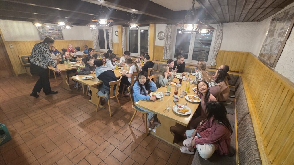 Daraufhin war es kein Wunder, dass das Essen heute eher sehr gut ankam. Wir feilen noch etwas an unseren malerischen Fähigkeiten, da es doch sehr lange gedauert hat das Plakat zu entziffern. Vorschläge wie Würmer, Cevapcici, und noch vieles mehr haben uns dann doch zweifeln lassen. Die Küche ist heute das erste mal kurz ins straucheln gekommen, allerdings noch lange nicht dem KO nahe. Spätzle mit Geschnetzeltem waren so beliebt, dass es knapp wurde. Aber wir haben dann doch alle satt bekommen. Die Skilehrer haben sehr zuvorkommend zurück gesteckt.