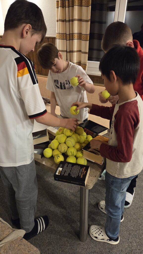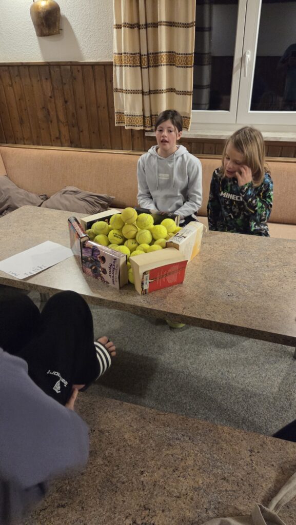 Das Abendprogramm – unsere allseits beliebte Hausrallye – bestand heute aus Tennisball stapeln, Nummern suchen, Pantomime, Cornhole-Säckle werfen, Würfel-Werf Kombinationen und Flaschen-Angeln. Kurzum – ein Programm bei dem alle viel Spaß hatten. Aber seht selbst: